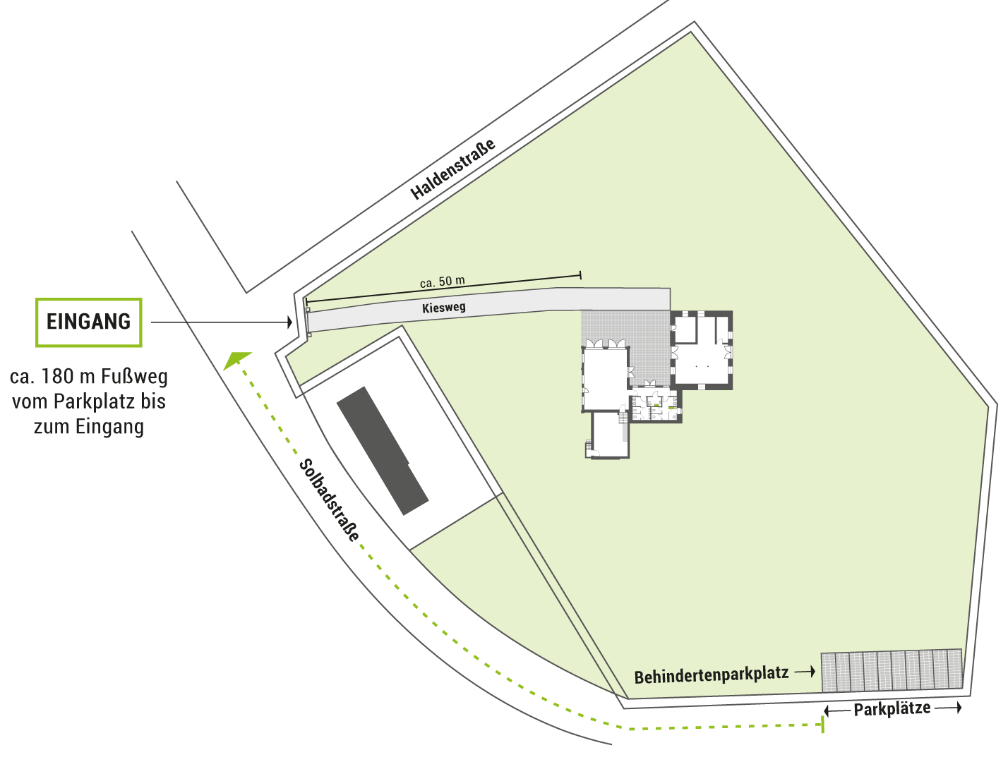 An der Solbadstraße befindet sich ca. 180 m rechts von der Zufahrt neben dem vorgelagerten Wohngebäude ein Parkplatz, der für Gäste der Zeche reserviert ist. Ganz links ist der Behindertenparkplatz (siehe die Karte unten).
